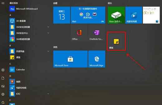 3、此时再点击开始菜单就可以直接在右侧找到“便签”;
