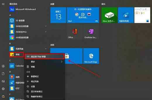 2、右键单击“便签”,在弹出选项中可以选中“固定到开始屏幕”;