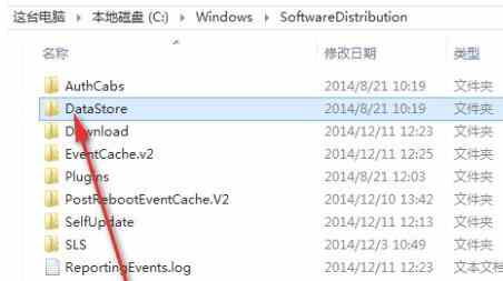 3、来到“C:\Windows\SoftwareDistribution”位置,将“DataStore”中的所有文件删除
