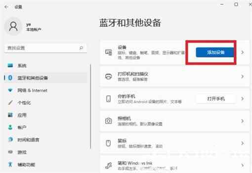 3、右侧点击【添加设备】,添加蓝牙或其他设备。