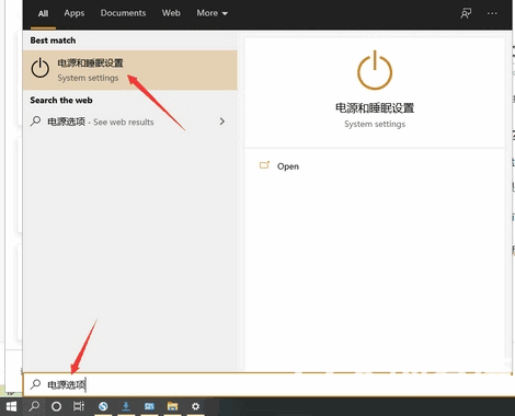 1、搜索框中输入“电源选项”,打开电源和睡眠设置。