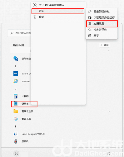 3.找到-记事本-右键单击 找到-更多- 点击-应用设置-