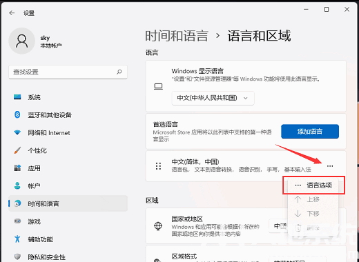4、点击中文简体右侧的三个小点,然后选择语言选项。