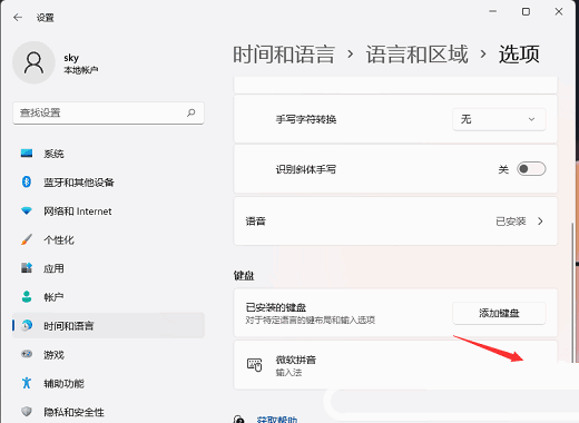 5、键盘下,找到微软拼音输入法右侧的三个小点,然后选择键盘选项。