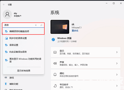 3、Windows 设置窗口,利用搜索框,输入语言,然后在打开的搜索结果中,选择编辑语言和键盘选项。