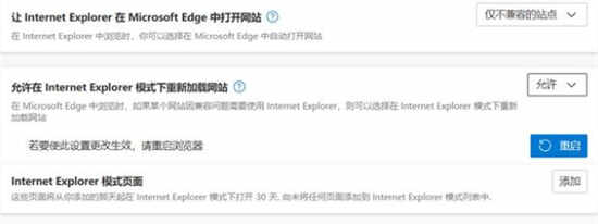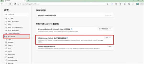 2、点击默认浏览器后,检查Internet Explorer 兼容性的允许在 Internet Explorer 模式下重新加载网站这一项,是否被设置成允许,如果为其他选项,则设置为允许并重启浏览。