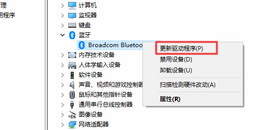 3、右击蓝牙驱动,弹出的界面,点击更新驱动程序