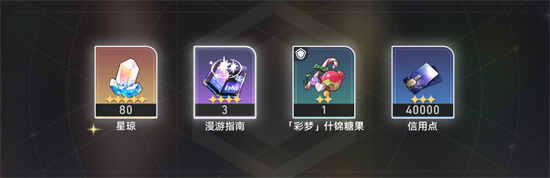 按要求提交相应食材后会获得80星琼(果然是变废为宝,好耶 ),3个漫游指南(角色升级材料),1个「彩梦」什锦糖果(名字真好听,结果吃起来是辣的)和40000信用点。这样第七天的美食「多味什锦彩梦糖」就完成啦!