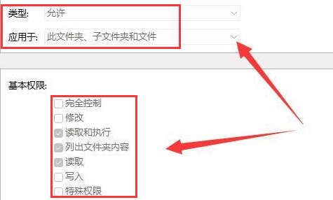 4、在文件夹的访问权限类型改为允许,并勾选下方所有的基本权限按钮即可