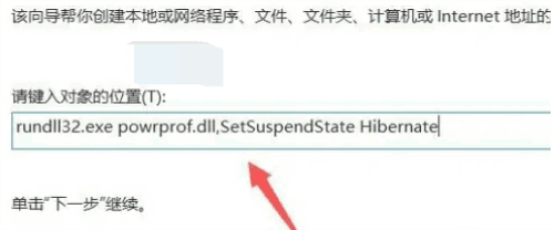 2.然后在快捷方式输入框内输入:“rundll32.exe powrprof.dll,SetSuspendState Hibernate”,接着鼠标点击“下一页”选项。