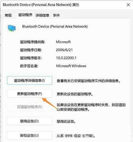 3、Bluetooth Device (Personal Area Network) 属性窗口,选择驱动程序选项卡,然后点击下面的更新驱动程序;