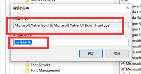 5、最后回到注册表编辑器,找到Microsoft YaHei Bold & Microsoft YaHei UI Bold(TrueType),再次将数值数据修改为想要的字体即可。