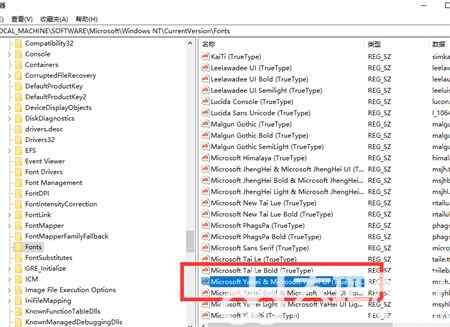 3、找到并点击fonts,在右侧列表中打开Microsoft YaHei & Microsoft YaHei UI (TrueType)。