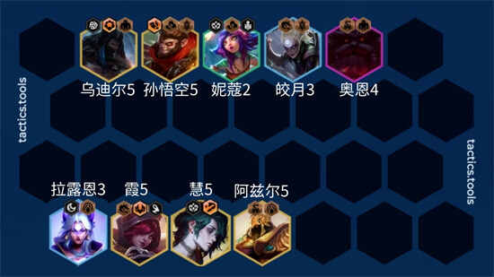 9人口,开始找五费卡,有慧了就开始花前排五费卡了,乌迪尔有了之后搭配奥恩前排会扎实很多。慢慢D二星五费卡了。成型强度还是非常不错的,阿兹尔蓝条加强后强度也提升不少,是一个不错的后排法系输出。