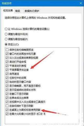 5、这时会打开性能选项窗口,在这里取消掉“平滑屏幕字体边缘”与“在桌面上为图标标签使用阴影”前的勾选,然后点击确定按钮;