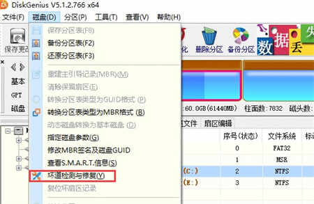 4、另外,如果是使用第三方分区软件进行的分区,或者恰好手头有这些分区工具,可以用它们对硬盘进行一次详细检查,同样能发现和屏蔽坏道。以DiskGenius为例,选择“磁盘-坏道检测与修复”,之后直接磁盘,点击“开始检测”,它就会对整个硬盘表面进行检测,并且确定扇区的健康程度。