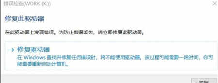 2、因为Windows 10自身就在监控硬盘运行状况,所以在执行检查的时候,如果已经监测出有问题的分区会直接显示修复选项。点击修复即可,修复时间要看硬盘的问题大小和坏道多少,不过总比在进入操作系统前检测修复要快得多,所以建议大家一旦感觉有问题,马上进行检测修复。