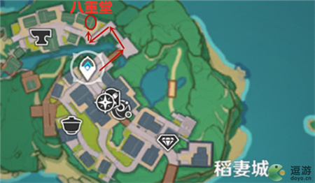 1.首先旅行者先传送到稻妻城上方的传送锚点这里,之后按照下图所示的路线走。
