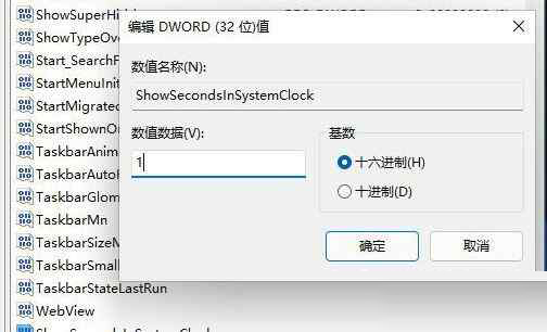 4、新建一个DWORD(32位)值,文件命名为ShowSecondsInSystemClock,双击打开将数值数据改为1,并点击确定,关闭注册表
