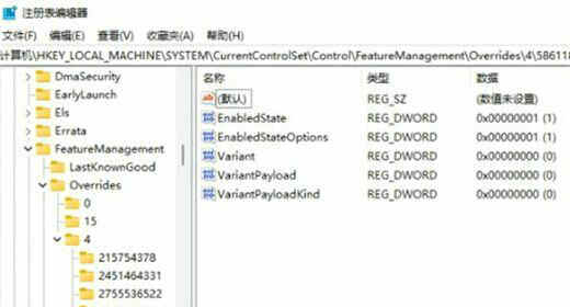2、定位到 HKEY_LOCAL_MACHINESYSTEMCurrentControlSetControlFeatureManagementOverrides4 右击创建新的项,命名为 586118283