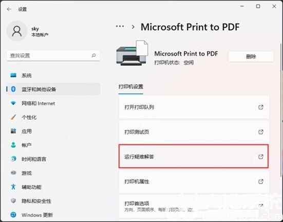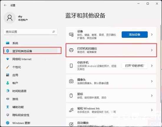 2、Windows 设置窗口,左侧边栏,点击【蓝牙和其他设备】,右侧点击【打印机和扫描仪(首选项、疑难解答)】;