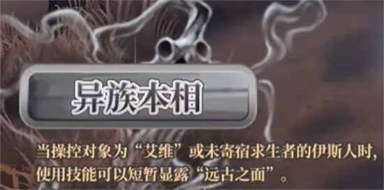当操控对象为“艾维”或未寄宿求生者的伊斯人时,使用技能可以短暂显露“远古之面”。当操控对象为寄宿状态下的伊斯人时,可通过长按技能键选取位置,向求生者短暂显露“远古之面”。若求生者在操控对象的15米范围内看到“远古之面”,将会被打断当前行为,并增加40点侵蚀度。