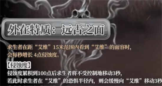 求生者在距“艾维”15米范围内看到“艾维”的面容时,会每秒增长4点侵蚀度。