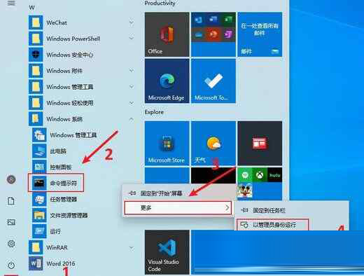 3、然后,返回到电脑桌面上,点击开始图标进到,选中Windows系统,右键点击命令提示符,选择大量,点击以管理员真实身份运行。