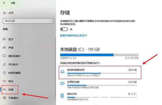 2、次之,左边寻找存储,在右边点击系统和保留空间,查看睡眠文件所占内存,影响是不是必须清理。