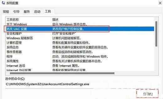 2、切换到“工具”,然后选择“更改UAC设置”,在点击“启动”进入“用户控制设置”。