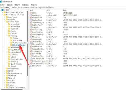 进入如下路径:HKEY_CURRENT_USER\Control Panel\Desktop\WindowMetrics。