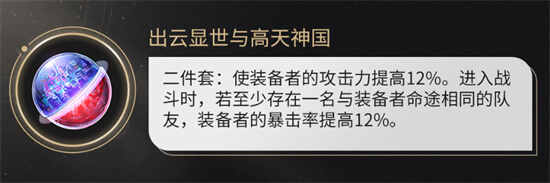 一、出云显世与高天神国 效果:增加装备者12%的攻击力,当战斗时至少有一名与装备者目标一致的队友,装备者的爆击概率提高12%; 获取:模拟宇宙9茨冈尼亚;
