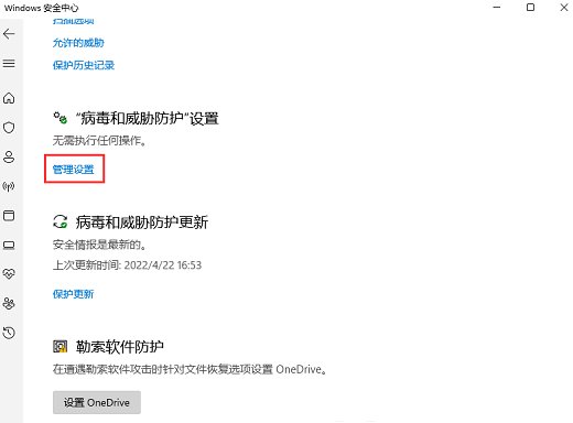 5、找到并点击“病毒和微信防护”设置下的管理设置;