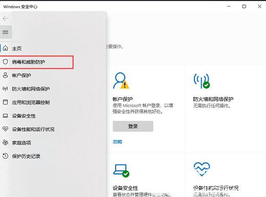 4、Windows 安全中心窗口,左侧边栏,点击病毒和威胁防护;