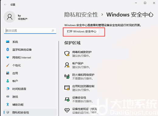 3、当前路径为:隐私和安全性 > Windows 安全中心,点击打开 Windows 安全中心;