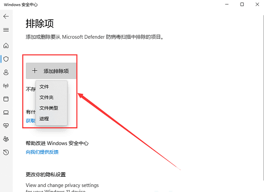 7、点击添加排除项(添加或删除要从 Microsoft Defender 防病毒扫描中排除的项目);