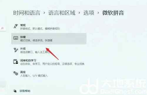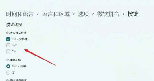 通常情况下大家如果按shift键的话是可以实现中英文切换的,但是它同时也是游戏的重要操作按键之一,为了避免干扰,有的win11用户想要禁用shift切换输入法,怎么操作呢?很简单,你先打开语言选项面板,然后打开微软拼音的键盘选项, 点击按键选项进入,在“中英文模式切换”下方取消勾选shift就可以了。