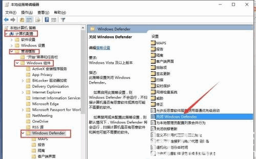 3、在本地组策略编辑器上点击“计算机配置-管理模板-Windows组件-Windows Defender”,在窗口右侧找到“关闭Windows Defender”。