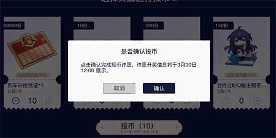 获得许愿币后,开拓者可进入页面「抽奖奖池」模块进行投币许愿。单次投币需要至少10枚许愿币。
