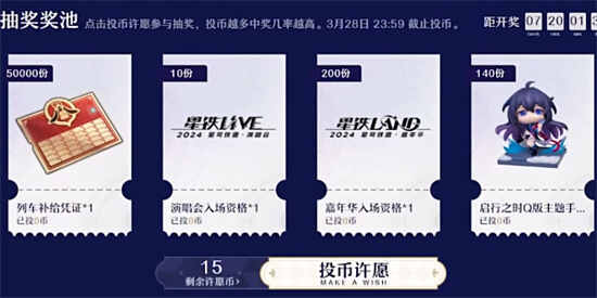 ※开拓者可点击「抽奖奖池」模块内「剩余许愿币」按钮查看许愿币获取明细。开拓者可在该页面内撤销历史投币,许愿币将会返还。每个角色仅可撤销一次。