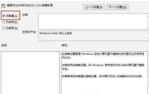 3.双击这两个选项可将其设置为“未配置”,然后单击“确定”,这个时候睡眠选项就回来了。