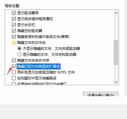 4、在高级设置中勾选“隐藏已知文件类型的扩展名”然后应用即可。