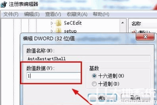 7、选择修改后会弹出一个编辑DWORD值对话框,我们将这个注册表的数值数据修改为1,然后点击确定。