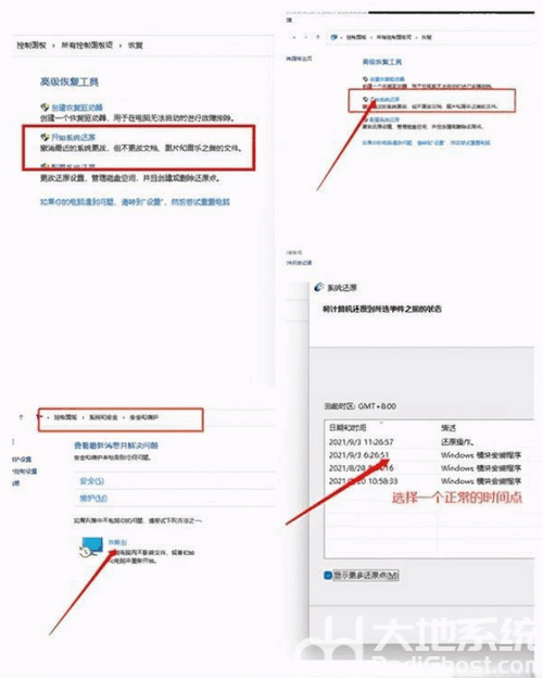 2、依次打开系统和安全--安全和维护--恢复--开始系统还原,选择一个正常的进行恢复