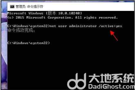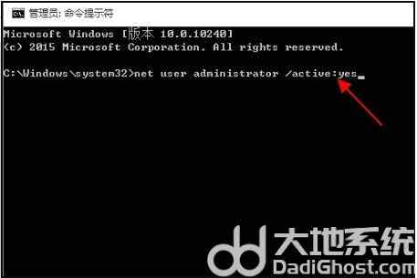 4、然后,完成上述步骤后,在命令行窗口中输入“net user administrator /active:yes”,按Enter键确认,如下图所示。