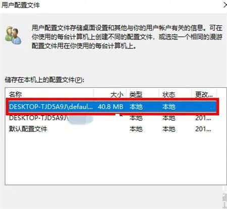 4.在弹出的用户配置文件对话框,选中储存在本地上的配置文件第一个含有defaultuser信息选项点击删除按钮即可解决。