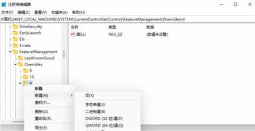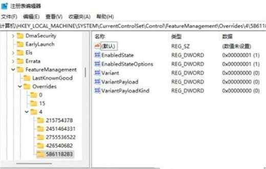 2、定位到 HKEY_LOCAL_MACHINESYSTEMCurrentControlSetControlFeatureManagementOverrides4 右击创建新的项,命名为 586118283;