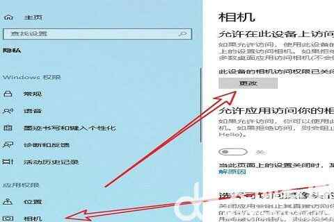 2、接着,在打开的隐私窗口中,点击左侧的“相机”菜单,在右侧窗口查看相机访问权限是否关闭,如果关闭点击“更改”打开就可以了;
