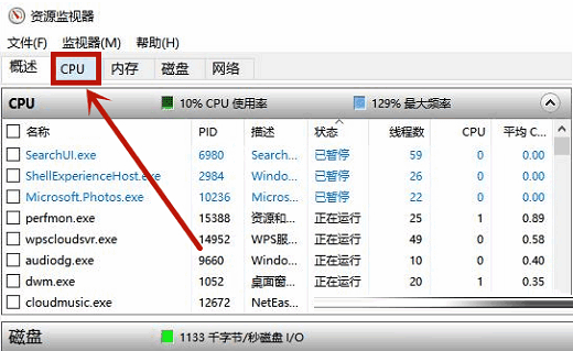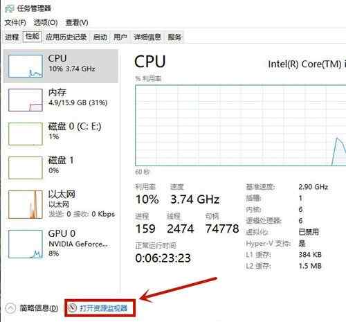 4、进入性能后,点击下方的“打开资源监视器”进入。