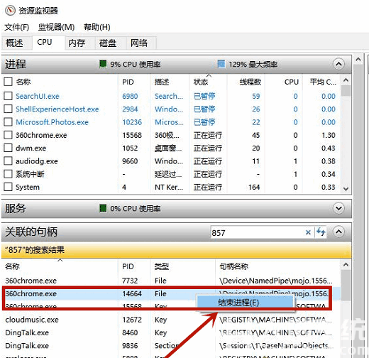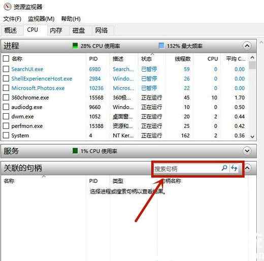 6、进入CPU页面后点击下方的“关联的句柄”在里面输入刚刚文件的“重用名”点击搜索。